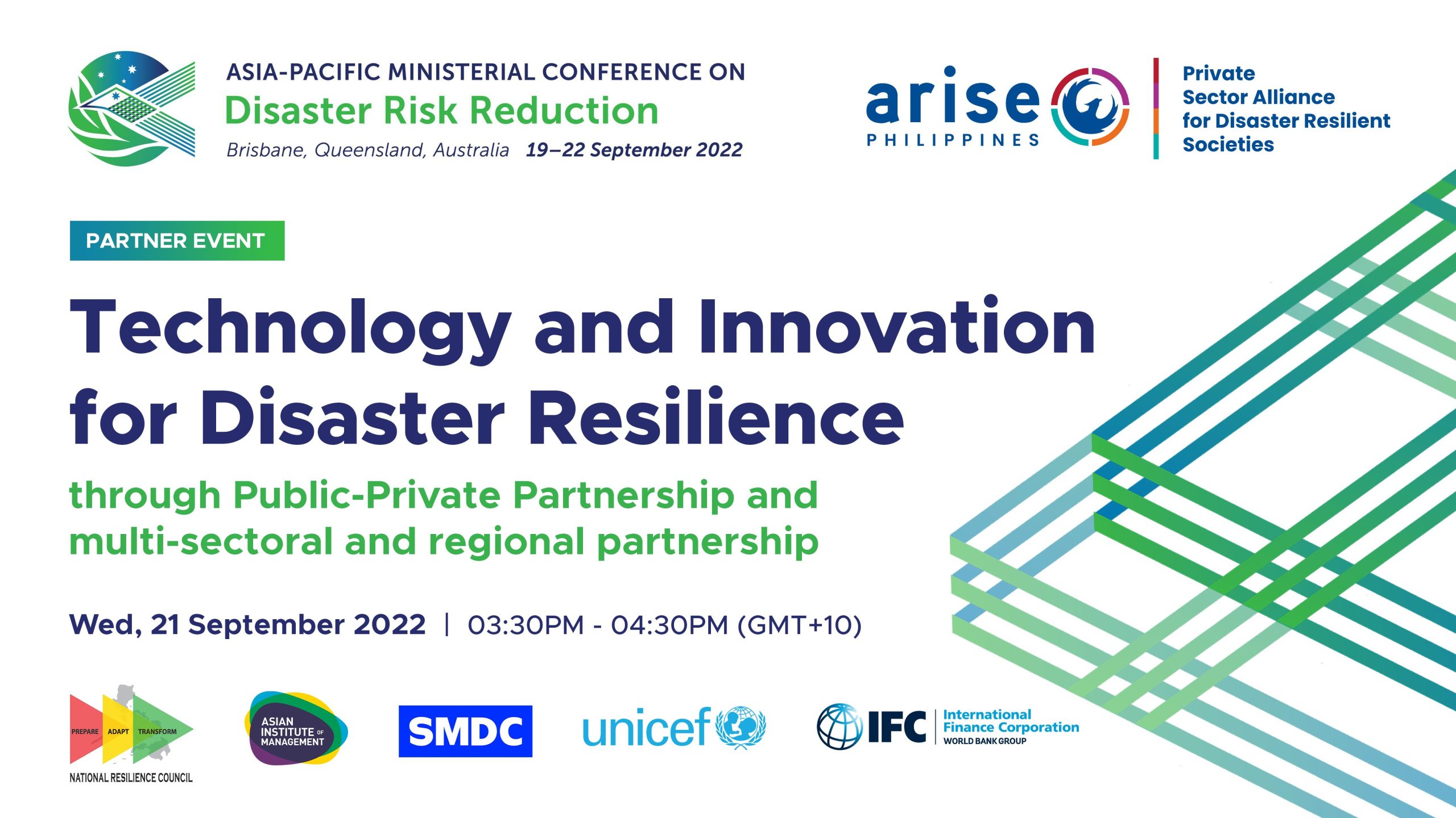 Brisbane, Australia – ARISE Philippines hosted a partner event on the third day of the 2022 Asia Pacific Ministerial Conference on Disaster Risk Reduction (APMCDRR). The event on the 21st of September was held in partnership with the National Resilience Council (NRC), Asian Institute of Management (AIM), SM Development Corporation (SMDC), UNICEF, and the International Finance Corporation (IFC).
